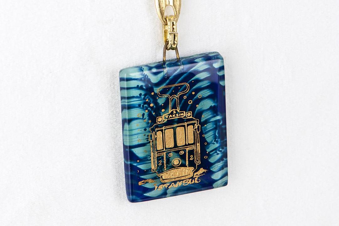 Cam füzyon mavi tramvay minyatür anahtarlık. %10 altın içerir.