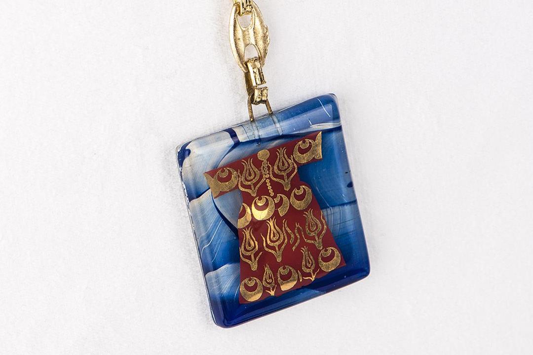 Cam füzyon mavi-beyaz kaftan anahtarlık. %10 altın içerir.