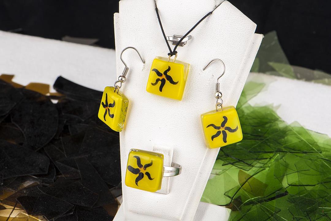 Cam füzyon küpe kolye yüzük seti.